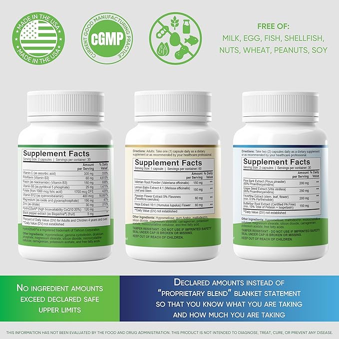 Doctor formulated, USPTO patent pending migraine supplements bundle for daily use & also for migraine discomfort days & for relaxation and tension relief. Bundle includes MigReForm containing magnesium, vitamin B2 (riboflavin), CoQ10 & MigRePair containing feverfew, PA-free butterbur, grape seed, pine bark & MigReLax containing valerian, lemon balm, passion flower, and hops. Most users report results in 1–3 months.