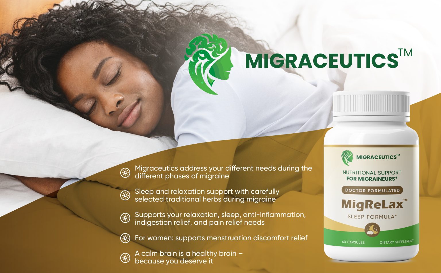 Migraceutics is a patent pending, holistic, natural product line formulated by a doctor based on decades of biomedical research and clinical trials with real migraine patients. Migraceutics provide migraine phase-specific and threshold strengthening targeted support. Our formulas acknowledge the phases of migraine: the ictal/migraine phase (premonitory, headache, postdrome, and aura stages), and the interictal phase; and that migraine is a sensitivity threshold disease. Migraceutics are designed to assist neural pathways in the body, and to support migraineurs’ impaired sensory thresholds (light, sounds, touch, smell, pain). Lack of sleep can be a trigger of migraine, which is improved with restful sleep. We specifically created Migraceutics – MigReLax with valerian, lemon balm, passion flower, and hops for migraine suffering women and men to support restful sleep and therefore provide migraine support especially during the premonitory and headache phases.
